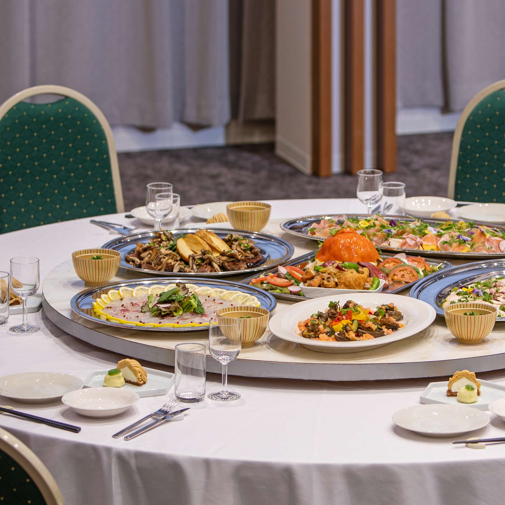 はい。ホテルシェフによるお食事を、円卓・卓盛・ビュッフェなどご希望のスタイルでご用意いたします。