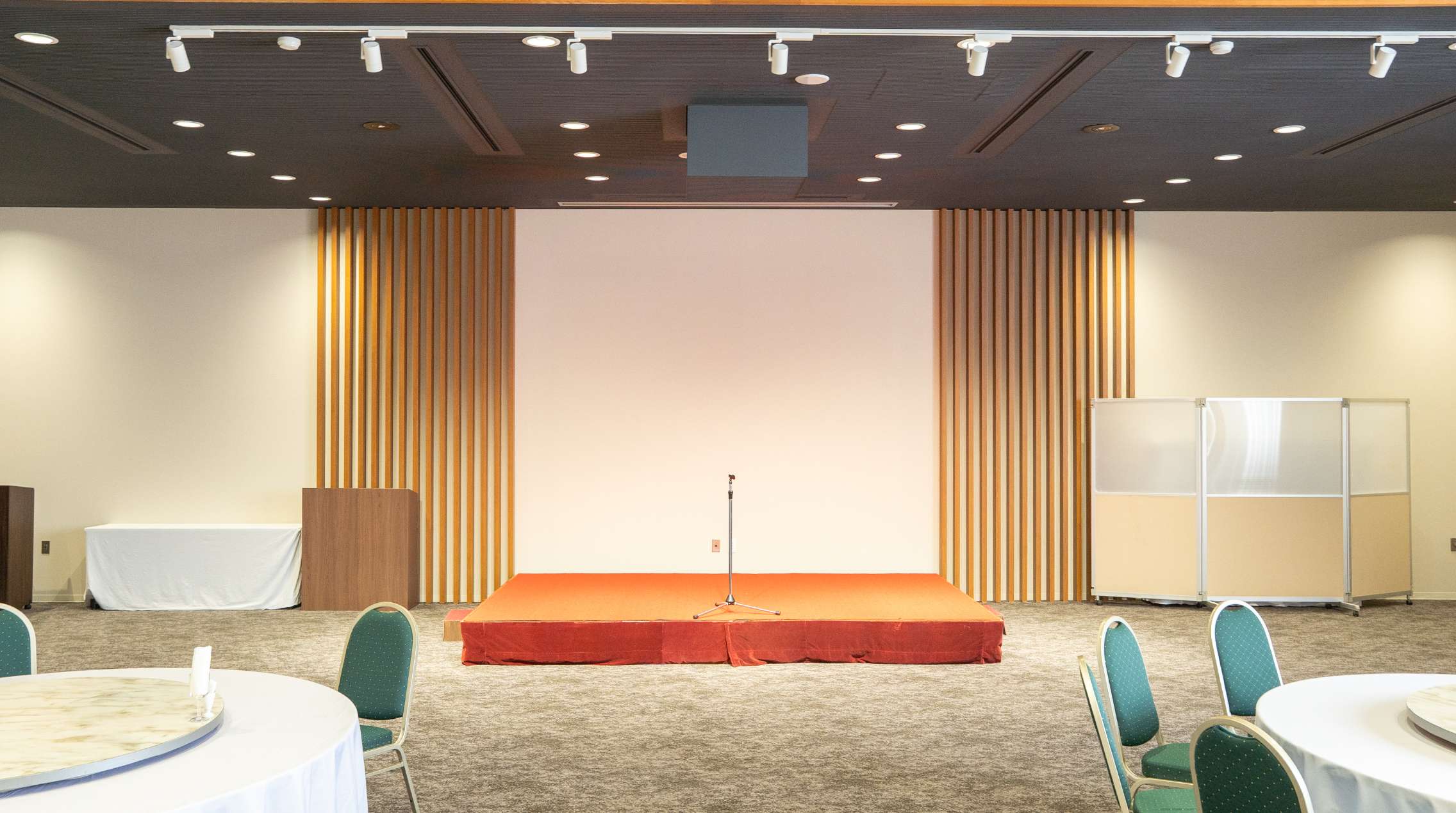 さまざまなレイアウトに対応可能です。プロジェクター、スクリーン、マイクなど設備も充実しており、立食パーティーや懇親会にもご利用いただけます。