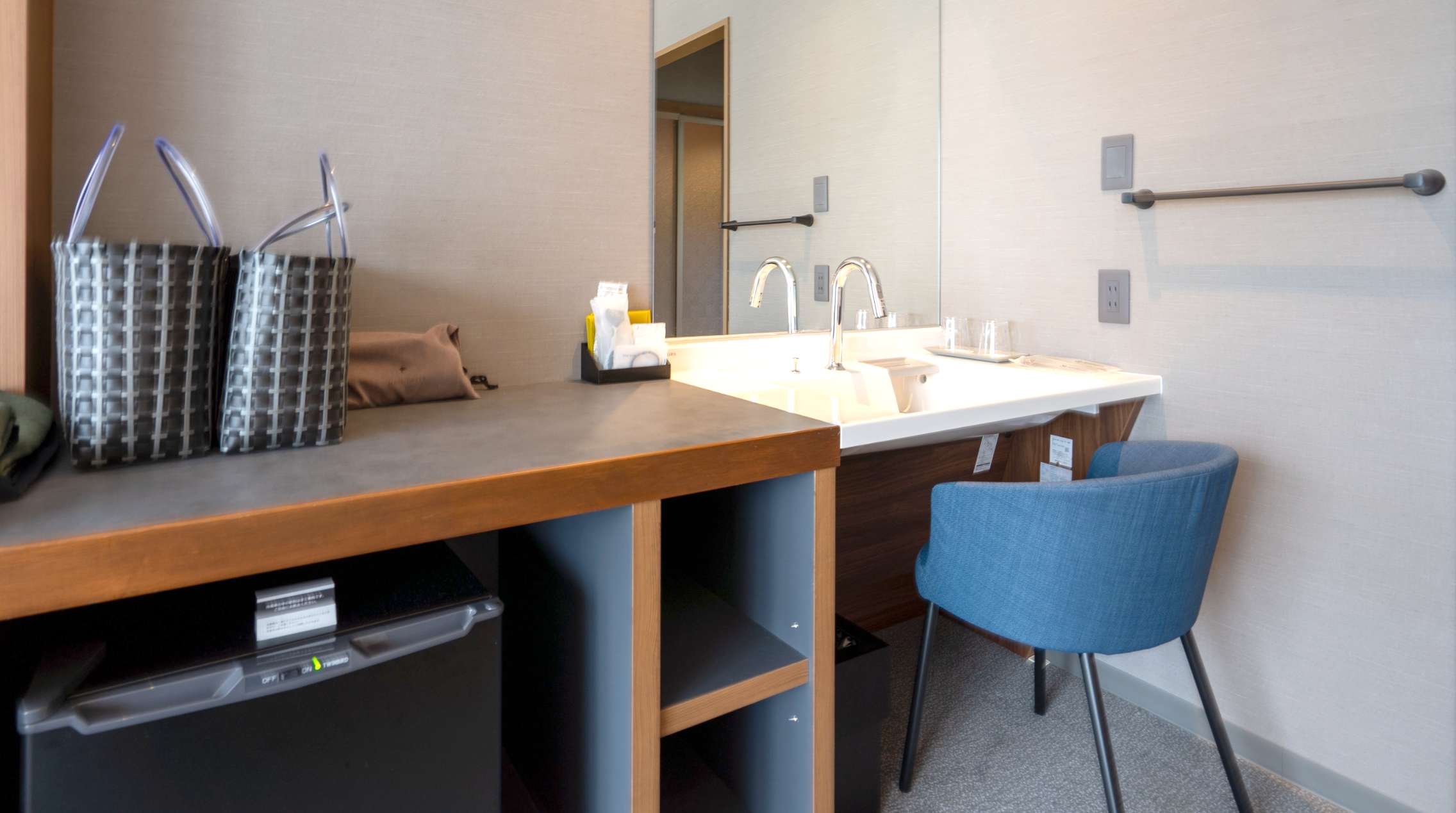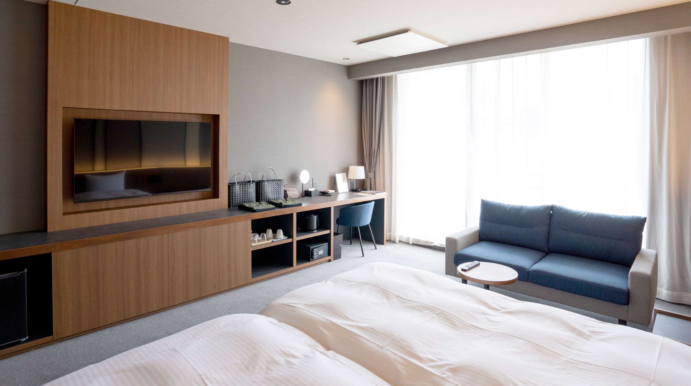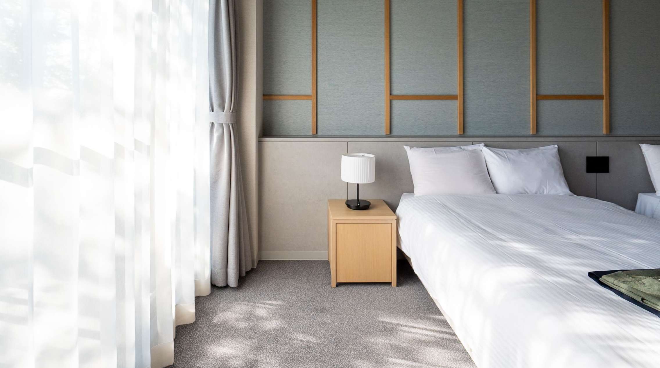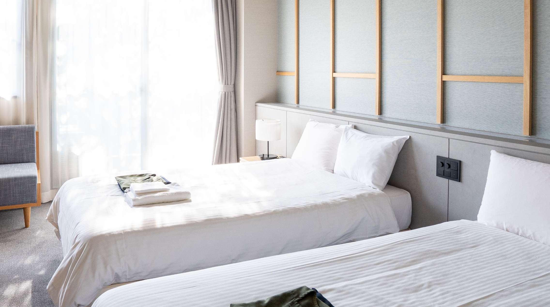 やわらかな照明と木の質感に包まれた、落ち着きあるツインルーム。